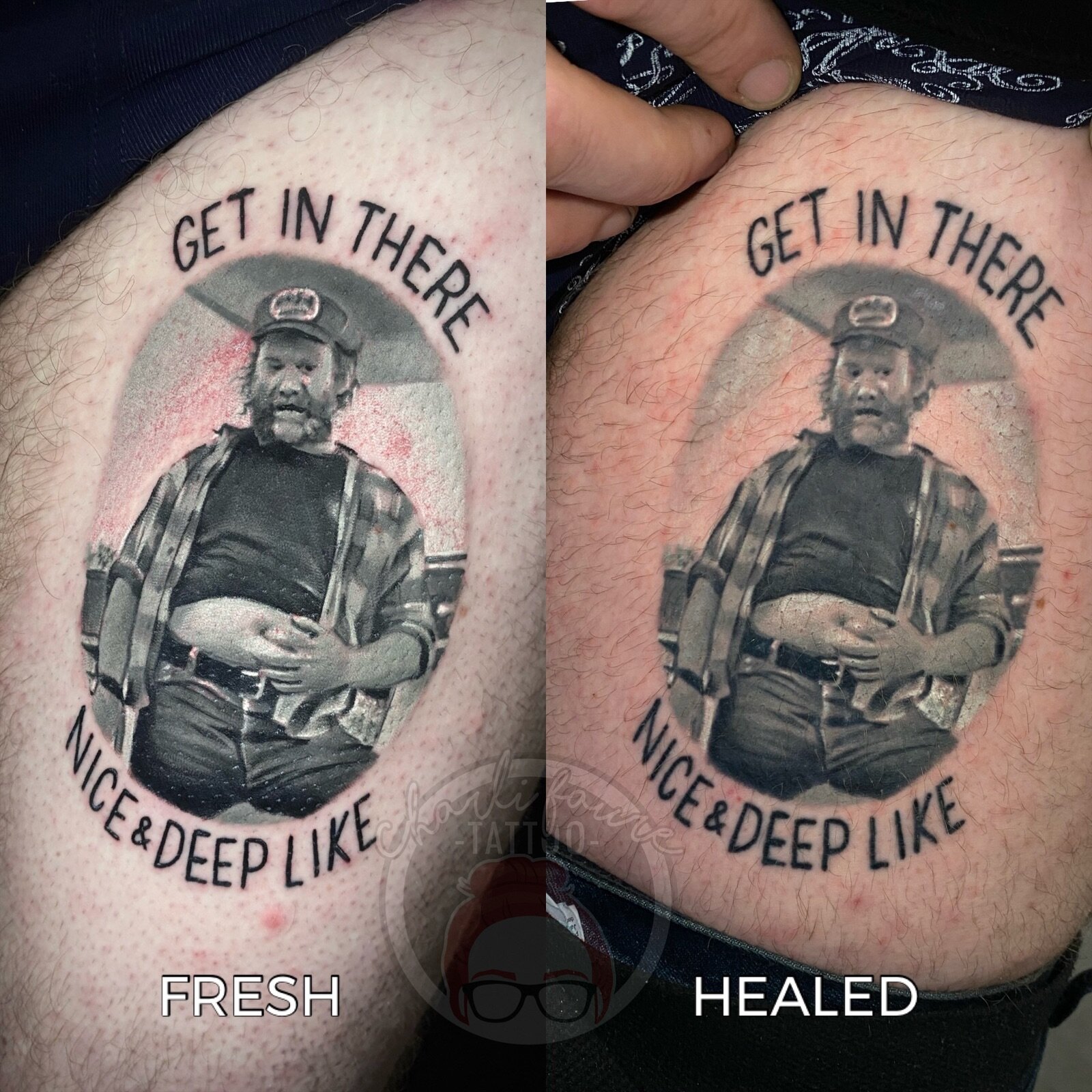 After two to three weeks, your tattoo should be healed. I always love seeing healed tattoos. If you’re able to swing by the studio so I can see how it healed and so I can get a good photo if it’s healed perfectly. Especially black and grey tattoos, they’re always red when they’re fresh and difficult to see properly, so I love getting to see them healed and when they heal perfectly, they always look so much better! If you think your tattoo might need a touch up, let me know.